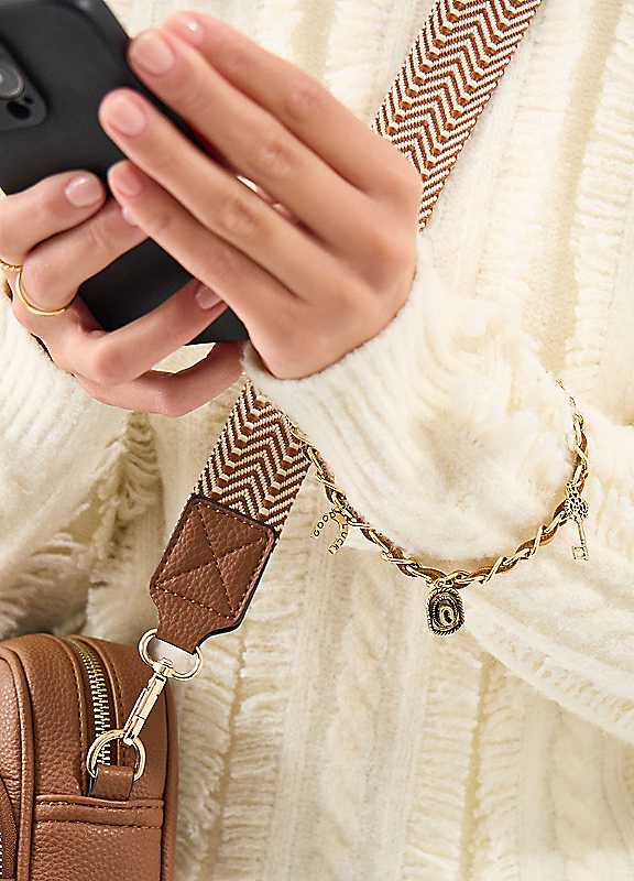 Chic and practical in equal measure, this phone strap is perfectly-sized to slip on your wrist, keeping it safe and secure as you're texting on the go. It's designed with soft fabric woven through the gold-tone link chain and finished with western-inspired charms.Wipe clean90% Alloy, 10% Polyester