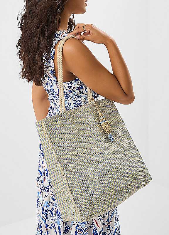 A reel catch for your holiday wardrobe, this shopper works as a beach bag and a carrier for all your local market finds. Woven in a striped metallic finish, it features a cute raffia fish bag charm dangling from rope shoulder straps. Finished with a magnetic button closure and small zip pocket inside.Wipe cleanOuter: 54% Cotton, 14% Polyester, 13% Acrylic, 7% Viscose, 5% Wool, 4% Metallised Fibres, 3% PolyamideLining: 100% PolyesterDimensions approx. 42H x 12W x 35L cm