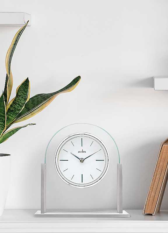 Good things come in silver and glass. The Wootton is an arched mantel clock that will create a focal point that's greater than its modest dimensions. The Wooton features bevelled glass with a brushed metal base, along with a chrome bezel, glass lens and energy efficient quartz movement.1 x AA Battery requiredMetal, Glass, PlasticDimensions approx. 14.8 x 14.5 x 4.9 cm | clock