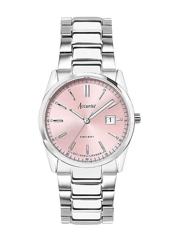 An everyday watch of extraordinary quality with British design. Accurist Everyday watches are an essential accessory. This watch has a solid stainless steel case with a peony pink sunray dial featuring diamond cut batons and a date display, protected by ultra scratch resistant sapphire crystal glass. Fastened with an interchangeable stainless steel bracelet and is water resistant up to 50 metres. Bringing the best of British design to everyday watches.Brand: AccuristCase and DialRound solid stainless steel 30mm caseScratch resistance sapphire crystal glassPeony pink sunray dialEngravable case backBraceletSolid stainless steel braceletMinimum length of bracelet: 130mmMaximum length of bracelet: 185mmStrap width: 16mmQuick release, changeable bracelet. This watch is compatible with any 16mm Everyday straps or braceletsMovement and FeaturesHigh precision Japanese quartz movement Miyota C-GM12-10ADiamond cut batonsA date display50 metres water resistanceComplimentary premium padded watch rollFREE 5 year* extended guarantee. (*Register online to receive a free additional three year guarantee)
