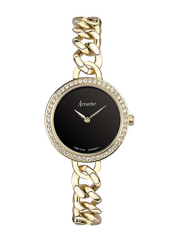Every dial is personal to you. Cut from natural semi-precious stones, all dials in the Accurist Jewellery collection have a distinctive pattern making them all unique. This watch has a black onyx semi-precious stone cut dial with a stone studded bezel. The dial is covered with scratch resistant sapphire crystal glass to protect your watch. Dial pattern may vary from image.With a solid stainless steel case and interchangeable stainless steel chain bracelet, you can easily change the bracelet to suit your tastes. Find your unique style in the Accurist Jewellery collection. Brand: Accurist Analogue Watch Black Dial Stone Set Gold Ion Plated Stainless Steel Round 18mm Case Gold Ion Plated Stainless Steel Chain Crystal Glass Gold Hands 30 Metres Water Resistance 10mm Strap Width Minimum strap length - 140mm Maximum strap length - 190mm Japanese Movement 2 Years Guarantee