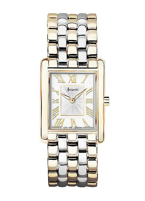 A stylish watch from a British watchmaker with vintage inspiration. This watch has a gold plated stainless steel, rectangular case with heritage inspired gold roman numerals and matching batons. The dial has a white sunburst pattern at the centre enclosed by scratch resistant sapphire crystal glass. Fastened with an interchangeable, two tone ion-plated gold and silver stainless steel bracelet, you can easily change your strap. Brighten up your look with a stylish, vintage inspired, colourful watch from the Rectangle collection.Brand: AccuristCase and DialRectangular, ion-plated gold, solid stainless steel 26mm case34x26mm caseScratch resistant sapphire crystal glassWhite dial with green roman numeralsEngravable case backBraceletTwo tone, ion-plated gold and solid stainless steel braceletMinimum length of bracelet: 150mmMaximum length of bracelet: 200mmStrap width: 19mmQuick release, changeable bracelet. This watch is compatible with any 19mm Rectangle straps or braceletsMovement and FeaturesHigh precision Japanese quartz movement Epson VX-0030 metres water resistanceComplimentary premium padded watch rollFREE 5 year* extended guarantee. (*Register online to receive a free additional three year guarantee)
