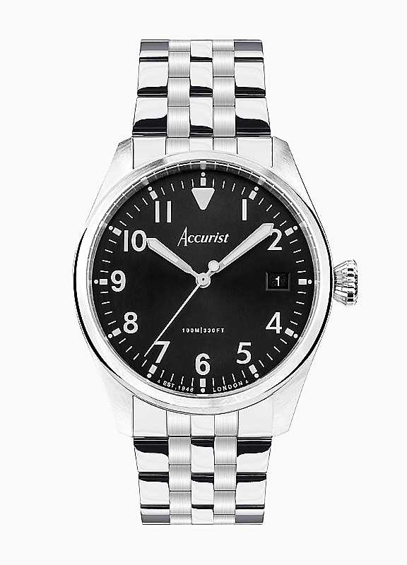 Finely crafted, premium aviation watches. Celebrate the heritage of aviation watches by Accurist. This watch has a solid stainless steel case with luminous hands and markers, a date display and a black dial enclosed by scratch resistant sapphire crystal glass. The watch has an interchangeable, quick release stainless steel bracelet. The watch is also water resistant up to 100 metres. The best of Accurist's heritage Aviation watches, made modern, for you. Brand: Accurist Analogue Watch Black Dial Silver Stainless Steel Round 41mm Case Silver Stainless Steel Bracelet Crystal Glass Silver Hands Date Display 100 Metres Water Resistance 20mm Strap Width Minimum strap length - 150 mm Maximum strap length - 210 mm Japanese Movement 2 Years Guarantee | silver metal watch, stainless strap watch, timeless mens watches, work watches for men, men's black analog watch, stainless steel wrist watch, steel watch bracelet, silver analog watch, black wrist watch for men, steel watches for men, classic analog watch, analog wrist watch, classic watches for men, silver wrist watch, sapphire crystal watch, steel strap watch, metal strap watch, round watches for men, vintage style mens watches, stainless steel watch bands