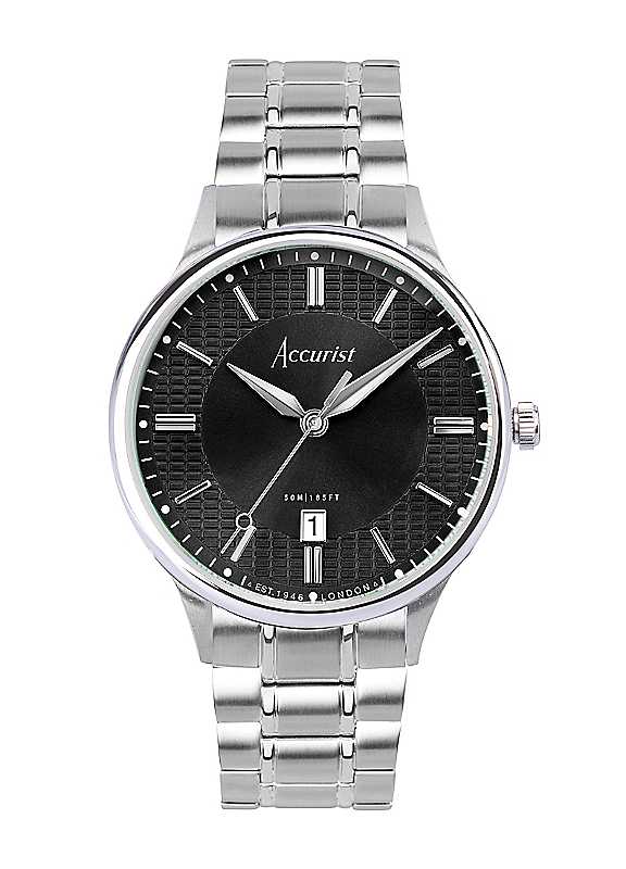 Celebrate quintessential British design with a Classic Accurist watch inspired by styles from our archives. Inspired by heritage models, this watch features a black, block textured dial featuring Accurist's heritage lollipop circular second hand and a date display. The watch has a slimline, solid stainless steel case protected by scratch resistant sapphire crystal glass and is water resistant up to 50 metres. Premium British designed watches, crafted to last a lifetime. Brand: Accurist Analogue Watch Black Dual Texture Dial Silver Stainless Steel Round 37mm Case Silver Stainless Steel Bracelet Crystal Glass Silver Hands Date Display 50 Metres Water Resistance 20mm Strap Width Minimum strap length - 155mm Maximum strap length - 208mm Japanese Movement 2 Years Guarantee