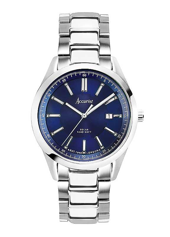 Bringing Solar technology to Accurist's most popular Everyday collection.Featuring a semi-translucent blue sunray dial with a date display, the Everyday Solar watch never require a battery and can charge enough for a full days power in just two minutes. At full charge, the watch has a power reserve of 120 days without any light. The Everyday solar watch can be charged with both direct sunlight and ambient light.The watch has a round, solid stainless steel case protected by scratch resistant sapphire crystal glass. The watch is fastened with an interchangeable, solid stainless steel bracelet and is water resistant up to 50 meters.The best of British design and solar power in every day watches.Brand: AccuristCase & DialRound, solid stainless steel 40mm caseScratch resistant sapphire crystal glassBlue dialEngravable case backBraceletSolid stainless steel braceletQuick release, interchangeable bracelet. This watch is compatible with any 18 mm Men's Everyday straps or braceletsMovement & FeaturesJapanese solar movement - Epson AS32120 day power reserveDate display50 metres water resistanceFREE 5 year* extended guarantee. (*Register online to receive a free additional three year guarantee)Strap width approx. 20 mmMinimum length of bracelet: 165 mmMaximum length of bracelet: 205 mm