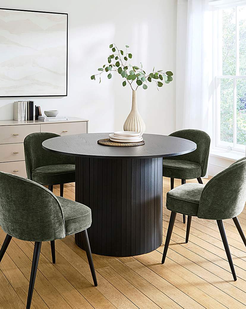 Addison Round Dining Table with 4 Emilie Chairs. This package includes: A round table, 4 Emilie dining chairs, upholstered in a velvet fabric and finished with tapered legs. Self assembly required.