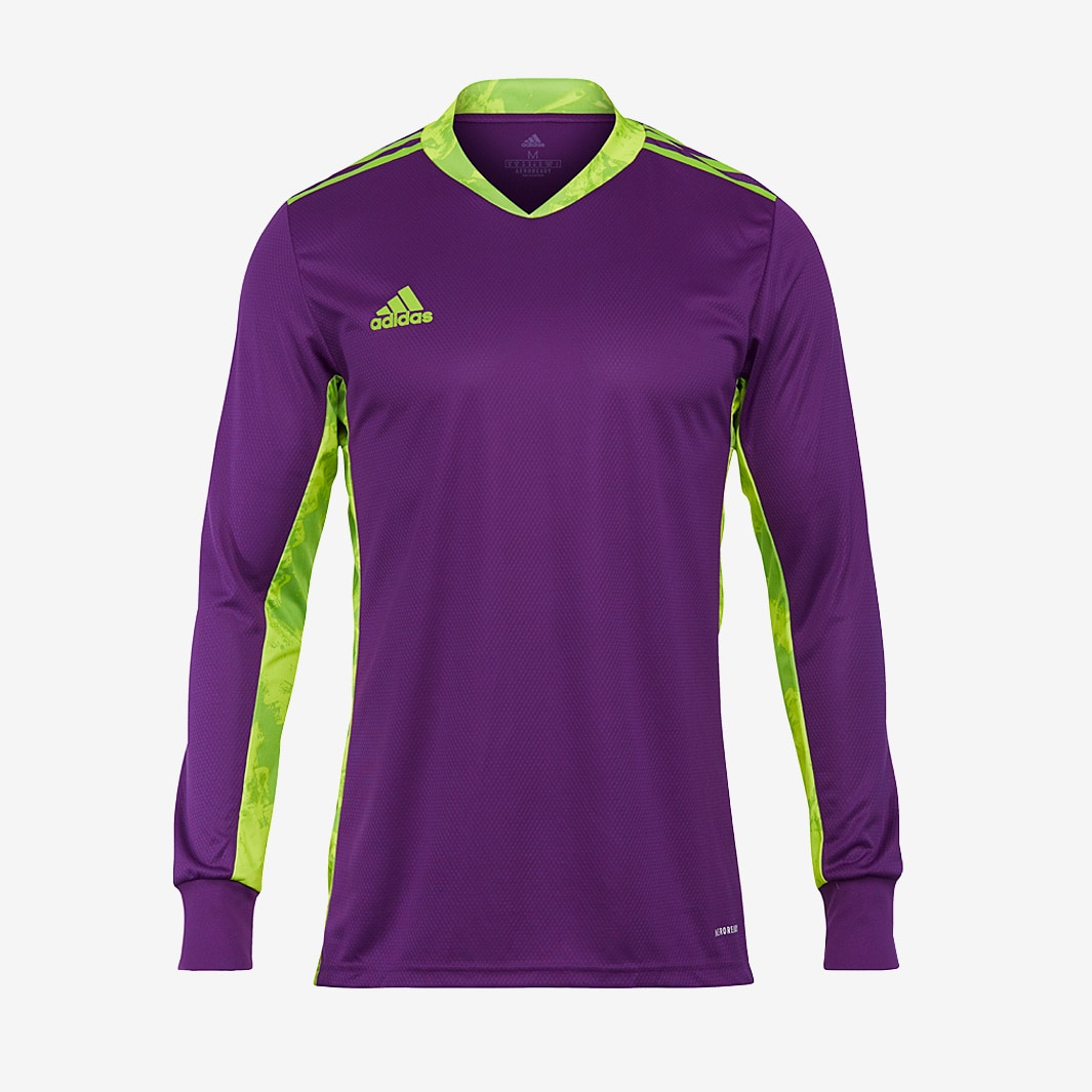 Dominate your box in the adidas Adipro 20 LS GK Shirt in Glory Purple, featuring a longsleeve design for extended coverage. Featuring a bold design with a pattern graphic down the sides, the adidas Adipro 20 GK Shirt makes sure youll catch the eye as you make spectacular saves. The tops lightweight AEROREADY construction keeps you dry and ready to move, while a neat Vneck collar ensures a comfortable fit. This jersey is made with recycled polyester to save resources and decrease emissions Graphic Vneck collar Lightweight, sweatwicking AEROREADY fabric Adipro jersey for goalkeepers Highlight graphics on sides and under arms 50 polyester, 50 recycled polyester mock eyelet
