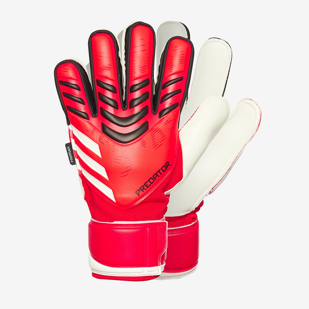 Play with total confidence wearing adidas Predator Match Fingersave goalkeeper gloves in Pure RubyLucid RedBlack, featuring an updated backhand for superior support. The refined latex elements in the punch zone provide grip while allowing natural flexion of the hand, integrating with the mesh body for ultimate wearing comfort whether catching or punching. Fixed FingerSave spines help guard against injury by preventing overextension. At the wrist, the closure features a halfwrap strap to lock you in and eliminate distractions. For grip, its the popular Soft Grip Pro formula, offering reliable performance in all conditions. Predator range endorsed by MarcAndre ter Stegen, Manuel Neuer, and Emiliano Martinez Cut Halfnegative Palm Soft Grip Pro latex Body 100 recycled polyester Backhand Ribbed mesh, polyurethane, and latex backhand Latex grip elements Wrist Closure Halfwrap elastic strap Protection Fixed FingerSave spines Extended latex grip on thumb Made in part with recycled materials