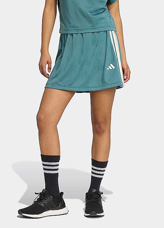 The adidas 3 Stripe Sweat Skirt is a stylish and functional piece for your activewear collection. Made with an elasticated waistline, this straight skirt offers a comfortable fit and easy movement. Its tennis-inspired design features an all-over jacquard pattern and iconic 3 striped print for a sporty look. Additionally, the integrated shorts provide added coverage and convenience. Perfect for any workout or casual day out, this skirt combines fashion and functionality seamlessly. Upgrade your wardrobe with the adidas 3 Stripe Sweat Skirt.Machine washable100% Polyester | outdoor skirt, elastic waist skirt, smart casual skirt, polyester skirt, spring skirt, pull on skirt, textured mini skirt, dark green skirt, teal skirt, striped mini skirt, casual skirt, mini skirt, built in shorts skirt