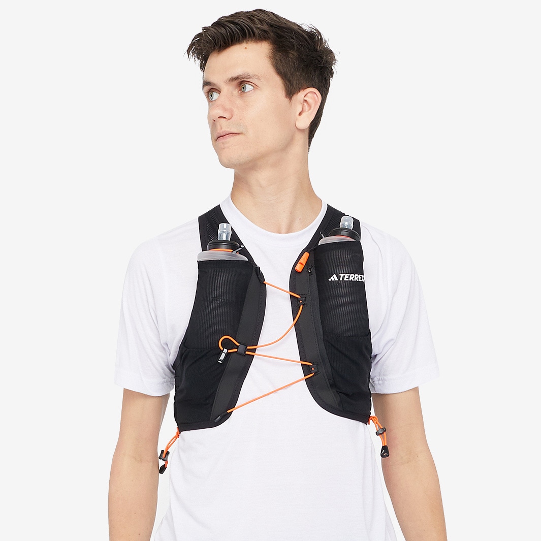 Extend your range on the trails with the adidas Terrex Trail Vest 2.5L in Black, an ultralight running vest that lets you store water and trail essentials and includes a bladder compartment. The adidas Terrex Trail Vest 2.5L is made from a breathable, sweat wicking fabric entirely from recycled PET.It features multiple pockets including stash pockets, and a chest pocket with bungee cords at the front for on the move adjustments. Volume 2.5 L85 polyamide recycled, 15 elastaneAEROREADYBungeeadjustable front and hemQuickdrying and lightweightBladder compartmentReflective
