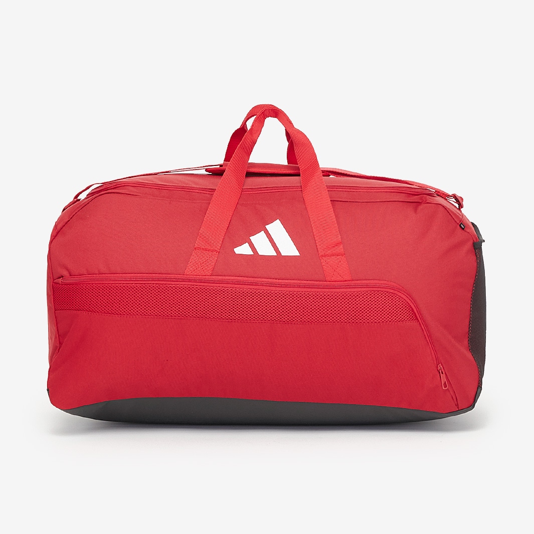 Equip yourself like the pros with the adidas Tiro League Duffle Bag Large in Team Power Red 2BlackWhite, designed to help you transport all of your gear to workouts and training. The large main compartment has enough room for all of your training or matchday needs, perfect for transporting balls, pumps, training cones or your teammates kits when they need a wash. A mesh pocket gives easy access to your water bottle, and a ventilated side zip pocket provides separate storage for your boots, so you dont have to worry about the rest of your equipment getting wet or muddy. Sturdy zips keep all of your gear secure, and a shoulder strap and dual carry handles make it effortless to move, even when its full. Made from 100 recycled polyester, this bag is perfect for the environmentallyconscious athlete looking to make a difference. adidas Tiro League duffle bag Large main zip compartment Ventilated zip bootshoe pocket Mesh side pocket Two carry handles Padded overshoulder strap 100 recycled polyester plain weave Large size 62L volume Dimensions 70 cm x 32 cm x 32 cm