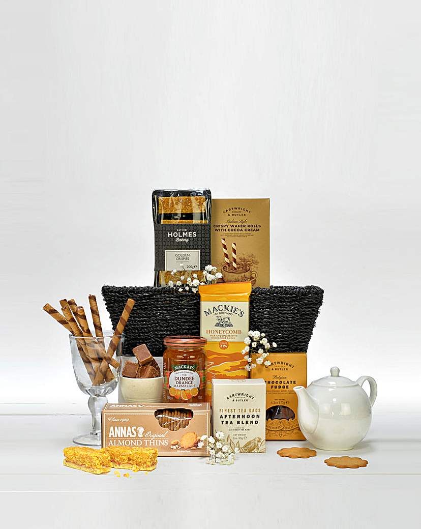 Bring the cafe home with a beautifully presented afternoon tea selection, packed with classic biscuits, rich chocolate and a jar of traditional marmalade - perfect for slow weekends, get well soons, birthdays, and thinking of you surprises. Its ready for an instant brew and biscuit moment. Includes: Brodies Scottish Afternoon Tea x20. Holmes Bakery Golden Toffee Crispies with layers of Tasty Biscuit and Raspberry Jam 200g. Mackays The Dundee Orange Marmalade made with Whole Fruit 340g. Annas Original Almond Biscuit Thins 150g. Cartwright & Butler Crispy Wafer Rolls with Cocoa Cream 150g. Cartwright & Butler Luxury Belgian Chocolate Fudge 175g. Mackies of Scotland Honeycomb Milk Chocolate Bar with Honeycomb Pieces 120g. Presented in a Black Paper Rope Tray. On occasion, due to stock issues, we may have to substitute some of the items. We will Always substitute to another product that is equal or greater in both value and standard.