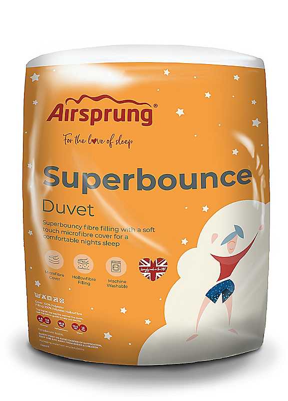 This is an Airsprung bounce hollowfibre-filled microfibre duvet. Brushed bounce microfibre fabric has been used on these duvets, which helps keep the filling trapped and gives a soft, smooth feel. This duvet is filled with soft hollowfibre filling, which is hypo-allergenic. It is constructed in a channel stitch to help evenly distribute and hold the fibre filling. Each strand of hollowfibre is perforated, allowing moisture to flow away from the body and also allowing easier airflow as you sleep. The product is carefully made in the UK.