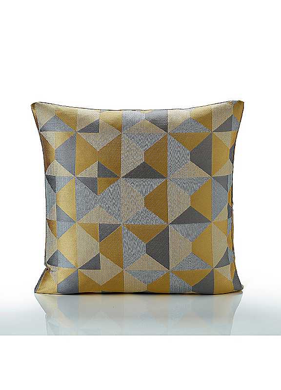 If you're looking for a stylish and comfortable way to add a touch of elegance to your living space, then this yarn-dyed jacquard geometric cushion is an excellent choice. Crafted from high-quality yarn, this cushion has been expertly dyed to produce vibrant, long-lasting colours that will brighten up any room.The intricate geometric pattern on the front of the cushion has been woven using a jacquard loom, giving it a luxurious texture and a three-dimensional effect. The reverse has the negative pattern, providing the choice of front or back decoration.The cushion's filling is made from premium quality materials, ensuring that it retains its shape and provides maximum comfort for years to come. Whether you're curling up with a good book, watching your favourite movie, or entertaining guests, this cushion is the perfect accessory to enhance your relaxation experience.Its versatile design means that it can be incorporated into a range of interior decor styles, from contemporary to traditional, and it pairs beautifully with a variety of different colours and patterns. Plus, its durable construction means that it is easy to care for and can withstand daily wear and tear. Brand: Alan Symonds Jacquard woven Sold individually Line dry Light iron only Machine washable 100% Polyester | contemporary decorative pillows, geometric couch pillows, synthetic pillow, metallic gold cushions, multicoloured cushions, square cushions, polyester filled pillows, woven decorative pillows