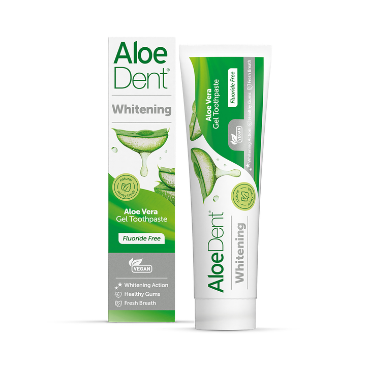 What Is It: Aloe Dent Whitening Toothpaste is a gentle, fluoride‑free toothpaste that promotes healthy gums and whitens teeth discoloured by tea, coffee, smoking and red wine. Aloe vera and silica clean and soothe while tea tree, peppermint and menthol provide cool minty freshness. Key Benefits: Whitens teeth discoloured by tea, coffee, smoking, red wine and other extrinsic surface staining. Promotes healthy gums with essential oils of tea tree, peppermint and menthol for gum protection. Fluoride free formulation using Aloe vera and silica to clean and soothe sensitive teeth. Key Ingredients: Aloe vera — soothes oral soft tissues and forms the toothpaste base; hydrated silica — a gentle mineral cleanser to remove surface stains; tea tree oil — an essential oil included to help protect gum health, complemented by peppermint and menthol for cool flavour.