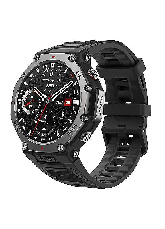 The Amazfit T-Rex 3 Onyx (Model 146-W2323GL1N) is a rugged, adventure-ready smartwatch engineered for the outdoors and fitness champions. Its large, 1.5-inch AMOLED display (480 x 480 px) delivers up to 2,000 nits of brightness for crystal-clear visibility under any conditions, even in bright sunlight. Built with a 316L stainless steel bezel and a polymer alloy body, it withstands extreme temperatures (-30 °C to 70 °C), offers 10 ATM water resistance (up to 100 m), and is certified for freediving Inside, it packs a powerful 700 mAh battery delivering up to 27 days of typical use, with GPS modes ranging from 42 up to 180 hours depending on settings. Adventure doesn't stop-you get dual-band GPS with 6-satellite systems, offline map navigation, 170+ sports modes, AI voice assistant, and comprehensive sensor arrays (heart rate, SpO2, altimeter, compass, ambient light, accel/gyro). Powered by Zepp OS, with Bluetooth and Wi-Fi connectivity, this smartwatch delivers advanced training, navigation, and survival-ready durability-all without breaking the bank.What's in the Box: Amazfit T-Rex 3 Onyx smartwatch, Charging cable and adapter, Quick start guideDisplay: 1.5 inch AMOLED, 480 x 480 px, 2,000 nits peak brightnessWeight (without strap): 68.3 gMaterials: 316L stainless steel bezel, polymer body, Corning Gorilla Glass screenStrap: 22 mm liquid silicone, adjustable 145-210 mmBattery: 700 mAh; typical use up to 27 days; heavy use up to 13 days; GPS modes:Standard GPS: 42 hExtended GPS: 114 hMax-battery GPS: 180 h Water Resistance: 10 ATM (100 m), certified for freediving (EN13319, ISO6425, GB/T 18828) Sensors & Features: Heart rate, SpO2, accelerometer, gyroscope, barometric altimeter, ambient light sensor, compass, dual-band GPS (6-satellite), voice-AI assistant, offline maps, 170+ sports modes, Zepp OS, Bluetooth 5.2, Wi-FiCase dimensions approx. 48.5 x 48.5 x 13.75 mm
