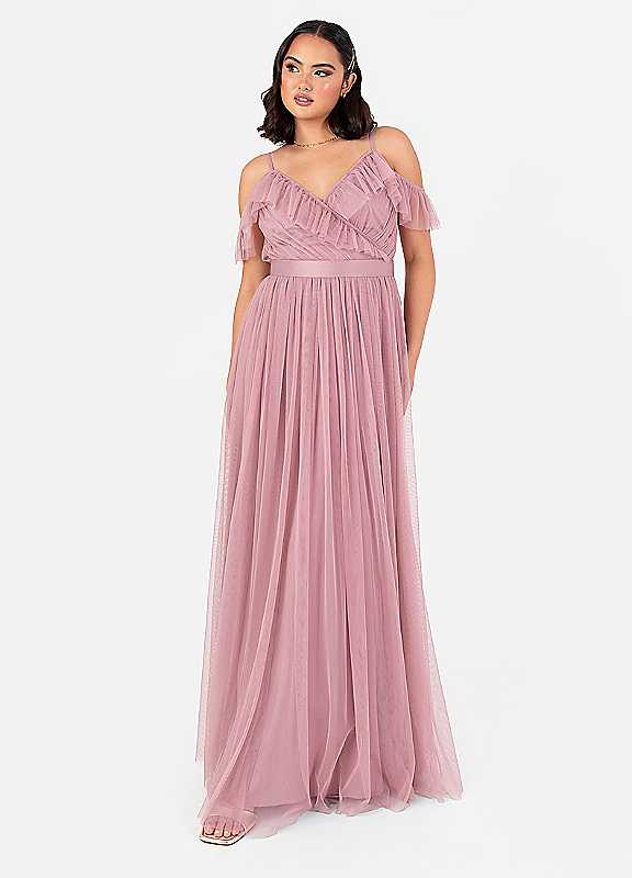 At Anaya with Love each item is consciously designed and made with recycled fabric allowing you to embrace both style and sustainability. This Blush Pink dress features a fitted faux wrap bodice with adjustable thin straps and the V-neckline which is adorned with ruffle detailing that forms feminine off-the-shoulder short sleeves. Anaya's classily gathered waist cascades into a flowing maxi skirt finished with a ruffled hem that moves gracefully with every step. Pair this maxi dress with your favourite gold strappy heels and statement earrings. Did you know you can mix and match our Anaya styles? Whether its's a preferred hue across multiple silhouettes or one shape in different colours you have the flexibility to tailor the look to suit each of your bridesmaids and your wedding theme perfectly.Machine washable at 30°C100% Polyester