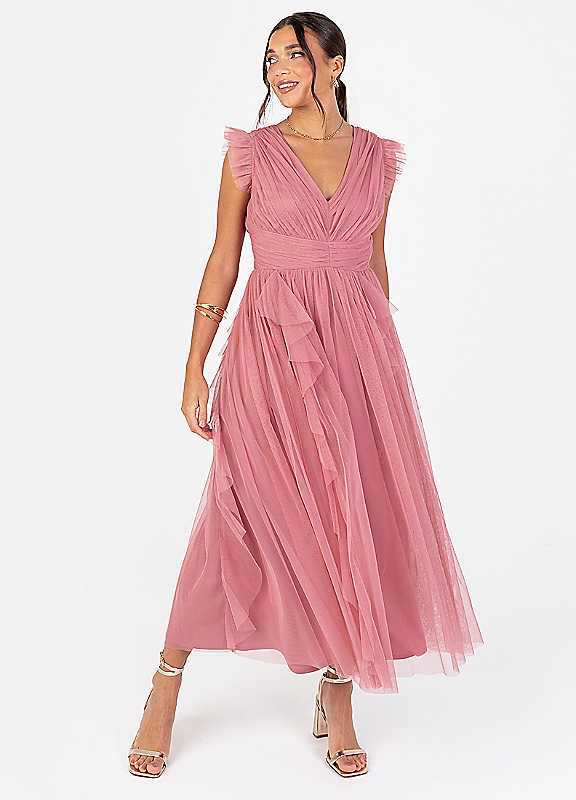 Anaya With Love Recycled Dusty Rose V-Neck Midaxi Dress with Waterfall Ruffle Detail - Pink - Size 6