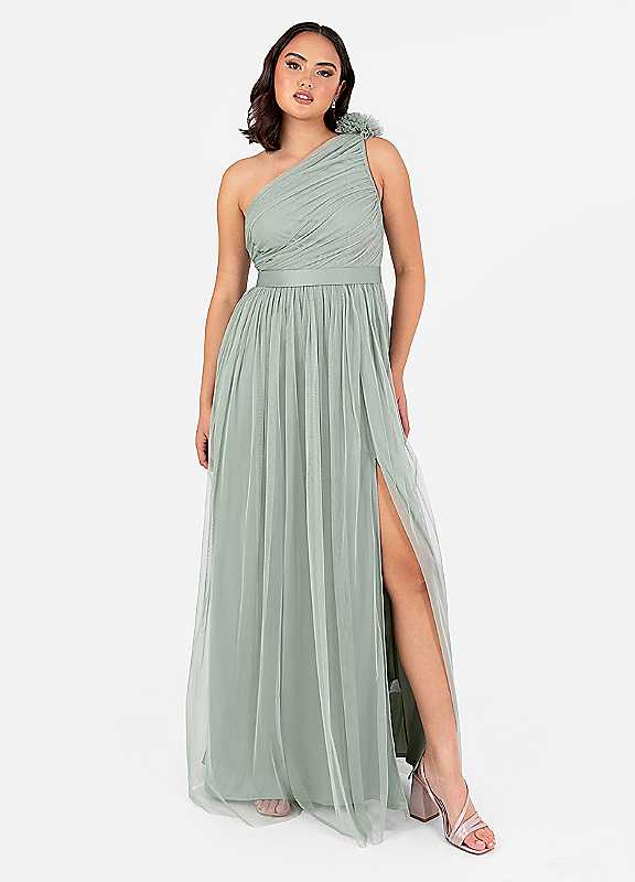 At Anaya with Love each item is consciously designed and made with 100% recycled fabric allowing you to embrace both style and sustainability. This elegant one-shoulder maxi dress is an ideal choice for bridesmaids or relaxed summer soir©es. Crafted from recycled tulle the design features a delicate gathering at the shoulder cascading into a form-fitting bodice before gracefully flowing into an A-line silhouette. The thigh-high split adds a hint of allure while a tulle rosette on the shoulder and a satin sash belt provide an enchanting finish. Comfortably body-lined this dress boasts a discreet side zip for a flawlessly seamless look.Machine washable100% Recycled Polyester (Excluding Trims)