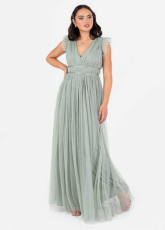 Anaya With Love Recycled Tulle Frosty Green V-Neck Flutter Sleeve Maxi Dress - Size 10