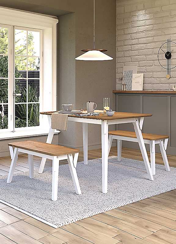 This dining set exudes modern Scandinavian simplicity with a touch of rustic charm. The 120cm table, crafted from responsibly sourced pine, features a rounded profile edge and sturdy angled legs with braces. The antique waxed tabletop showcases the natural beauty of the wood grain, while the wax finish on the legs adds an elegant contrast. Paired with two benches that tuck neatly underneath, this compact set is perfect for creating an inviting dining space. Each bench, accommodating two people, echoes the table's design, offering both style and comfort. Ideal for small dining areas or kitchens, the set combines functionality and aesthetics seamlessly, making every meal a delightful experience. Seats 4 Minimal assembly required Grey washed wax finish Pine Please remember to measure your available space before ordering. If using on an un-carpeted floor we recommend rubber or felt protection pads be used under the legs to avoid damage to your floors. For Assembly Instructions click here