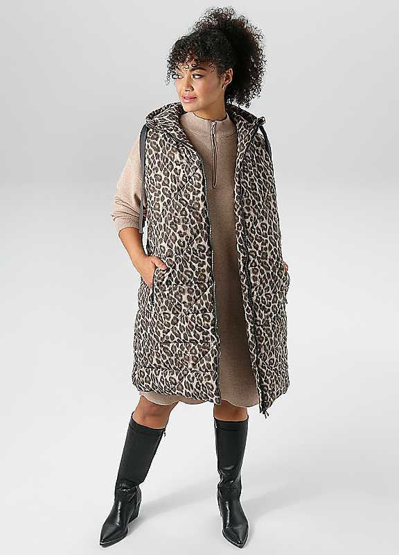 Stay on trend with our Animal Print Quilted Gilet. This hooded, quilted style is the perfect addition to your winter wardrobe. Featuring a 2-way zip and zipped pockets, it's both functional and fashionable. The close fit design makes it a must-have outdoor vest for any fashion-forward individual.Not suitable for tumble dryingOuter & Lining: 100% Polyester | sports gilet, printed vest, quilted puffer vest, black gilet womens, quilted vest womens, fitted vest, gilet with hood, black quilted vest, plus size winter outerwear, quilted vest, casual outerwear, vest with pockets, long black gilet, plus size winter vests