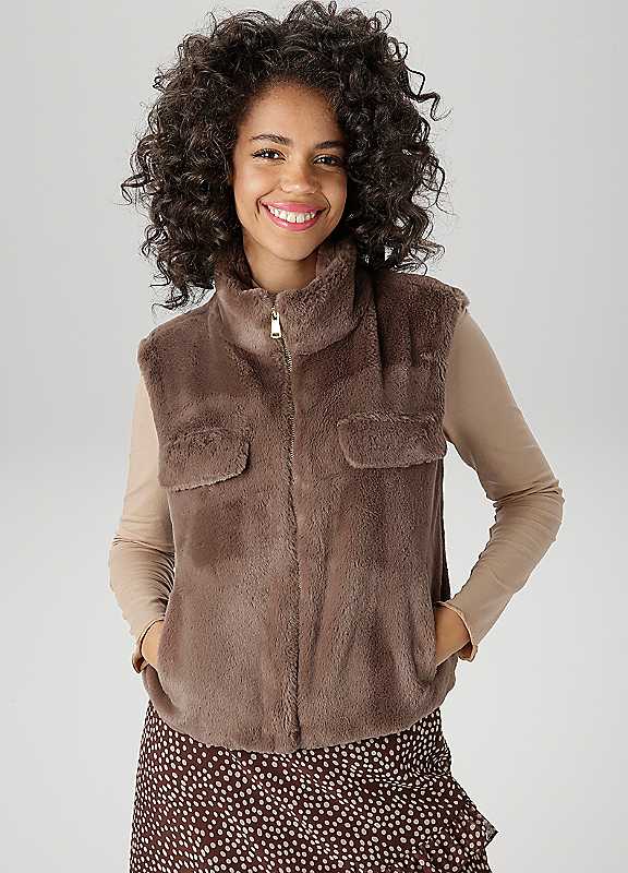 Stay warm and stylish this winter with our Aniston Faux Fur Vest. This lined vest features a stand-up collar and 4 functional pockets for added convenience. The gold-coloured zip closure adds a touch of elegance to this casually cut short vest with a slightly elastic hem. Upgrade your winter fashion game with the Aniston Faux Fur Vest.Do not washOuter & Lining: 100% Polyester | faux fur vest, brown faux fur jacket, fur vest, faux fur coat, vest with pockets, faux fur short coat, stand up collar