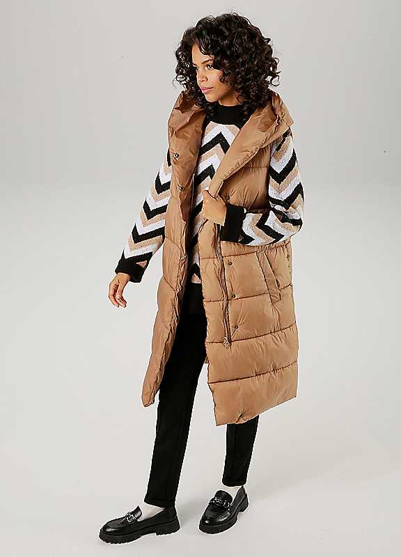 This Aniston Hooded Longline Quilted Gilet is perfect for casual wear. Made for the modern woman, it features a plain design that effortlessly elevates any outfit. The long zip on the side seams adds a touch of edginess while the concealed 2-way zip and snap fasteners ensure a secure closure. Stay warm and stylish with this versatile gilet. Brand: Aniston Machine wash Outer material: 55% Polyester, 45% Polyamide Lining: 100% Polyester Padding: 100% Polyester Length approx. 102 cm Please Note: European sizing tends to run smaller than UK. We suggest sizing up for the perfect fit!