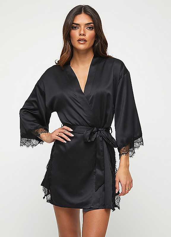 This Robe is a knee length wraparound with a tie belt waist, detailed with seductively sheer eyelash lace panels from hip to thigh and lace trimmed cuffs. Layer over a Chemise for a romantic night in.40°C Mild washDo not bleach, do not tumble dryDo not iron, do not dry cleanSatin: 100% PolyesterLace: 100% Polyamide Excluding TrimsKeep away from fire.