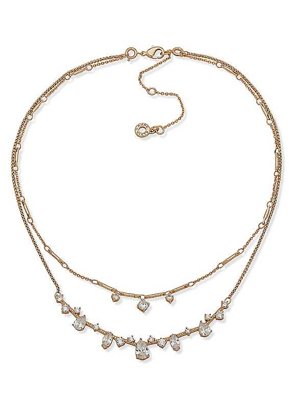 This layered necklace from Anne Klein features delicately detailed gold chains and shining crystal pear drops. A truly elegant and feminine silhouette. 40% Brass, 30% Zinc, 15% Glass, 10% Copper Coated Beads, 5% Steel | double layer necklace, pearl drop necklace, layered pearl necklace, layered gold necklace, glass bead necklaces, gold chain with pearl, brass necklace, gold pearl necklace, pearl pendant necklace