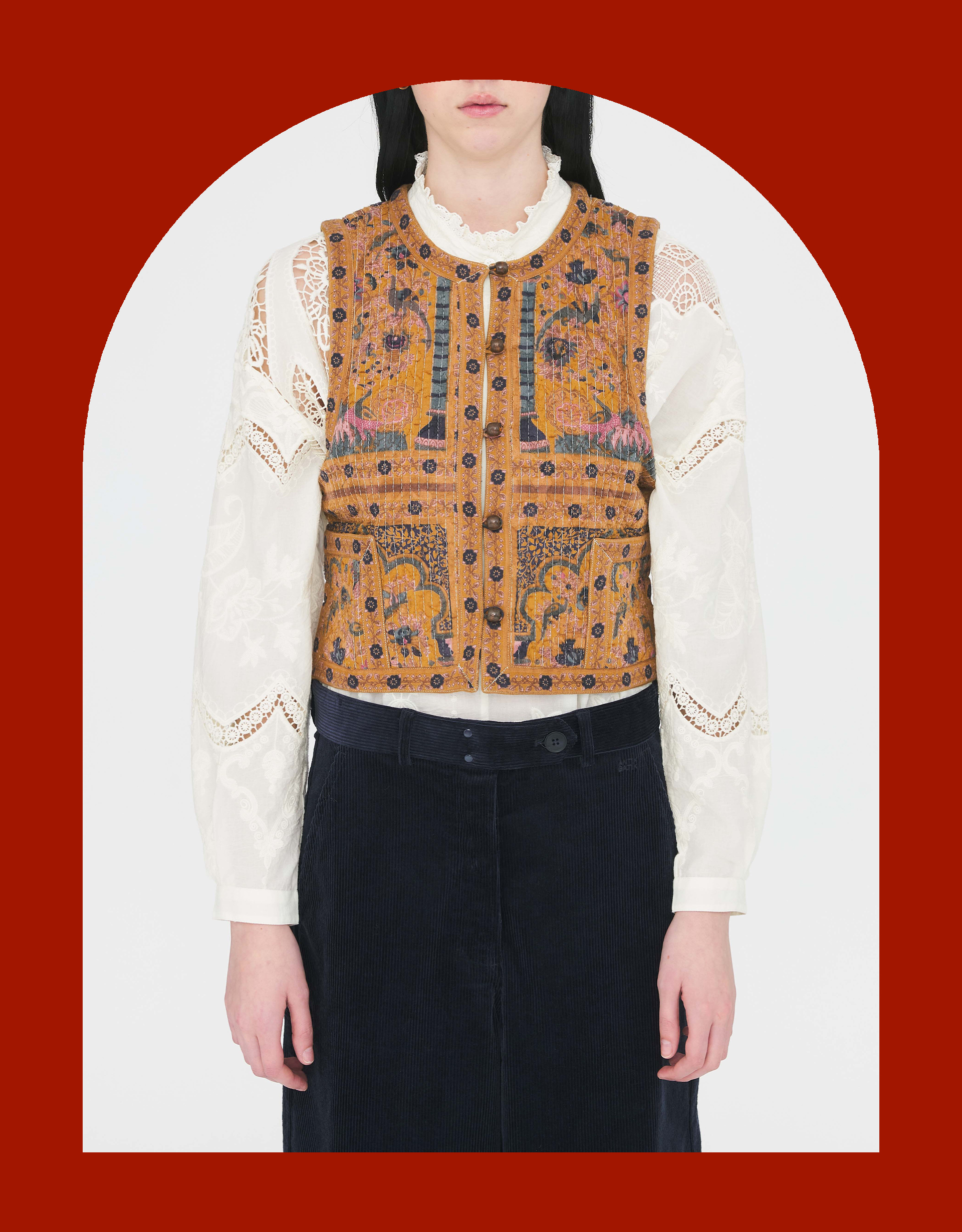 The brand: Looking for sartorial treasures that scream boho chic? Antik Batik is your answer. Designed in Paris and made for the dreamers and globetrotters, expect to find well-crafted clothing and accessories adorned with artisanal embroidery, weaving and printing techniques.The product: Simply the vest. An artful pick to style over all the blouses and t-shirts in your wardrobe. Printed with decorative flora and fauna and woven with a fil-coupé effect, giving raw texture to the jacquard fabric, this waistcoat features wooden buttons and two patch pockets. Our favourite part? The contrast printed lining.The fabric and fit: Crafted in cotton. Sizing in-line with Antik Batik. Camel