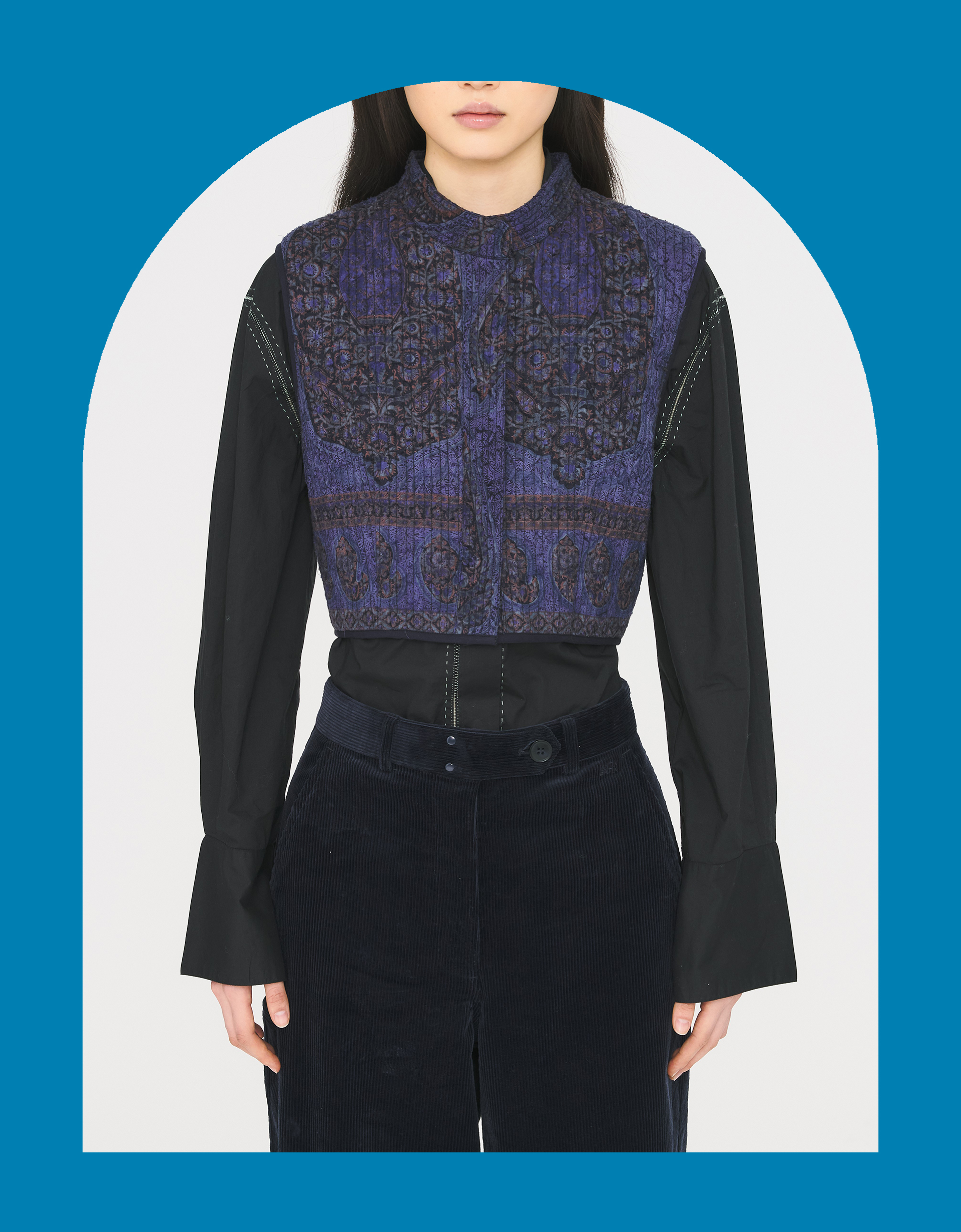 The brand: Looking for sartorial treasures that scream boho chic? Antik Batik is your answer. Designed in Paris and made for the dreamers and globetrotters, expect to find well-crafted clothing and accessories adorned with artisanal embroidery, weaving and printing techniques.The product: Vest in show. A charming pick to style over all the blouses and t-shirts in your wardrobe. Printed with ornamental paisley motifs and woven with a fil-coupé effect, giving raw texture to the jacquard fabric, this quilted waistcoat features discreet buttons and a cropped hem. The fabric and fit: Spun in cotton. Sizing in-line with Antik Batik. Blue