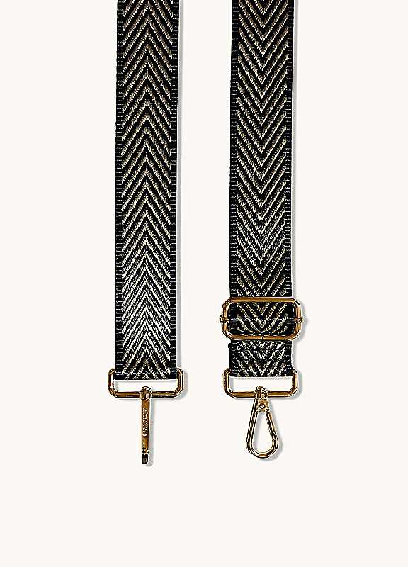 Make a statement with apatchy london's black and gold chevron strap, the perfect accessory for any fashion-forward outfit.95% Woven Nylon, 5% Gold HardwareWoven Strap: Minimum length approx. 64 cm approx. & maximum length approx. 122 cmMinimum length approx. 25 inches, maximum length approx. 48 inchesWoven strap width approx. 3.8 cmApprox. 1.5 inches