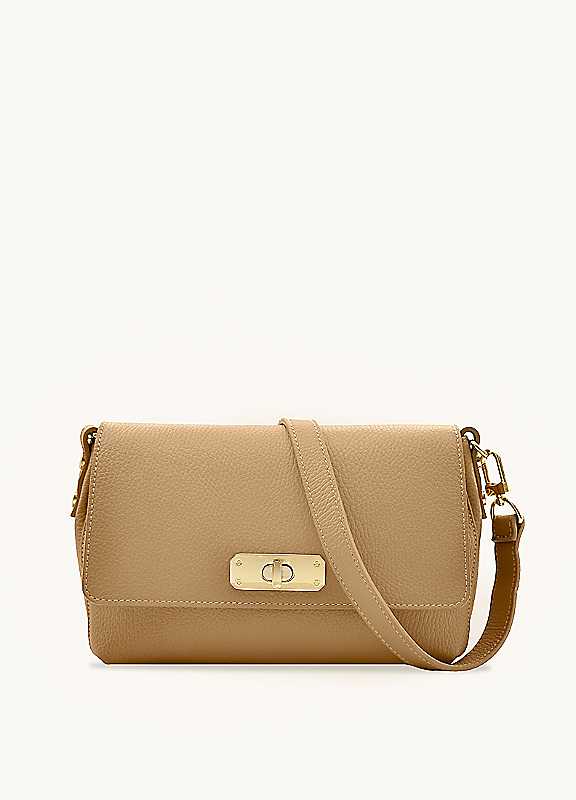 The Maisie Midi Bag is destined to become your ultimate plus one, offering all the charm of the beloved Maisie bag but with added space for those extra necessities. Perfectly sized to carry your everyday essentials and more, it is set to be your go-to bag. Crafted in Italy from luxurious grained pebble leather, the Maisie Midi Bag is fully lined and showcases iconic gold detailing, complete with a sophisticated twist lock clasp. This elegant handbag easily accommodates all your essentials such as a wallet, keys, mobile phone, and cosmetics along with a bit of extra room for items like sunglasses and e-book. Delivered in a branded dust bag, with an adjustable smart strap that can be slung over the shoulder or lengthened for a trendy cross-body carry.Wipe clean100% Leather | brown leather purse, structured purse, gold handbags, purse with long strap, brown leather shoulder bag, pebble leather bags, quiet luxury purses, turn lock bag, leather crossbody bag, neutral bags, metal purse, brown leather handbag, structured bags for work