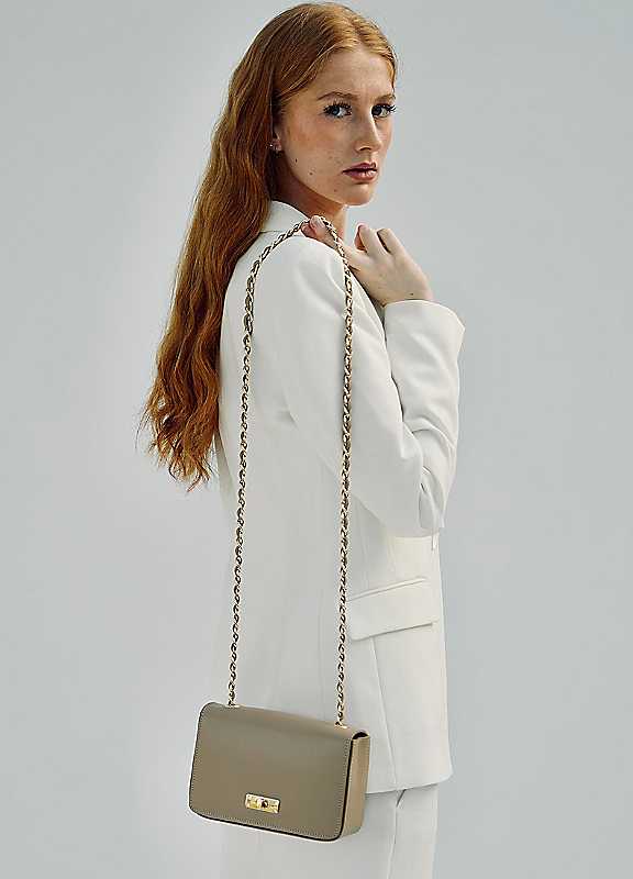 The grace bag exudes timeless elegance with a hint of opulence, seamlessly transitioning from day to night. Crafted from premium box leather, this lightweight, compact accessory offers versatility with both shoulder and crossbody wear. Its refined design is accentuated by a sleek front flap, secured with a striking gold twist-lock clasp, while the leather-plaited chain strap adds a sophisticated touch. Whether dressed up or down, the grace bag elevates any ensemble, making it a must-have addition to your wardrobe. This classic handbag will easily accommodate your essentials such as a purse, keys, mobile phone and cosmetics. Features an internal zipped pocket. The stylish bag is delivered in a branded dust bag.Wipe clean100% Leather