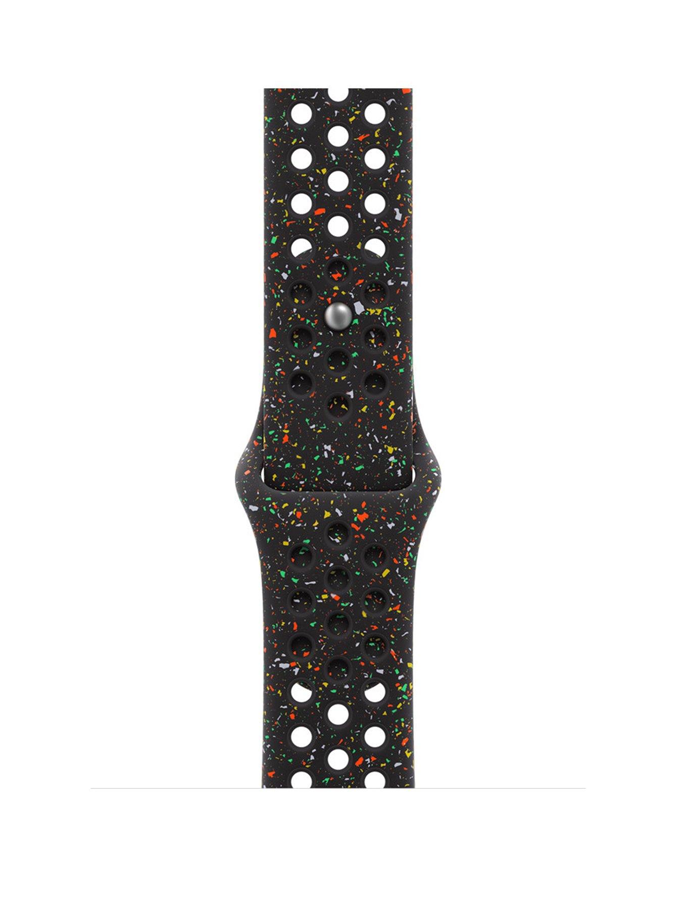 Apple Watch46mm Midnight Black Nike Sport Band - M/L Made with compression-moulded perforations for breathability, the Nike Sport Band is durable and strong, yet surprisingly soft. It features colourful flakes that create a randomised pattern, making each strap unique. The smooth, dense material drapes elegantly across your wrist and feels comfortable next to your skin. An aluminium pin-and-tuck closure — carefully etched with the Run Swoosh logo — gives the pin a fresh matt finish. Compatibility Apple Watch Models 44mm 45mm 46mm 49mm M/L Strap fits 160-210mm wrists Lightweight perforated design for maximum airflow Durable fluoroelastomer ideal for training Pin-and-tuck closure for a secure fit Designed for comfort during intense workouts Designed for all-day comfort and active lifestyles Charger required: N