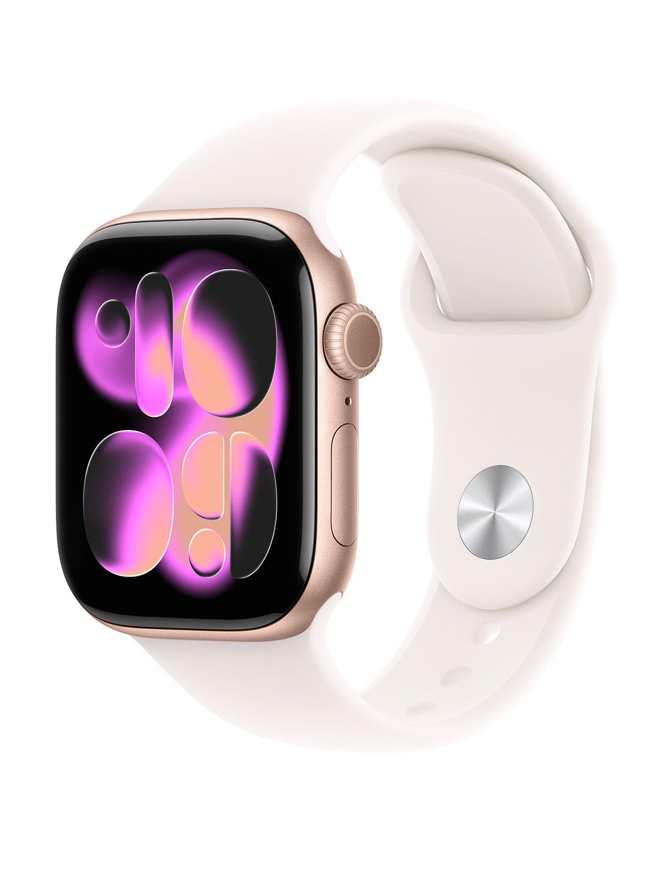 Get invaluable insights about your health. Apple Fitness+, the ultimate fitness experience powered by Apple Watch. Get 3 months free when you buy Apple Watch. Offer available to new subscribers who purchase an eligible device. £9.99/month after free trial. No commitment. Plan automatically renews after trial until cancelled. Only one offer per Apple ID. This offer is not available if you or your family have previously subscribed to Apple Fitness+. Restrictions and other terms apply. Introducing Apple Watch Series 11. With hypertension notifications, 1 sleep score, and up to 24 hours of battery life. 2 HYPERTENSION NOTIFICATIONS Apple Watch Series 11 can spot signs of chronic high blood pressure and notify you of possible hypertension. 1 KNOW YOUR SLEEP SCORE Sleep score provides an easy way to help track and understand the quality of your sleep, so you can make it more restorative. EVEN MORE HEALTH INSIGHTS Take an ECG anytime. 5 Get notifications for a high and low heart rate, an irregular rhythm 6 and possible sleep apnoea. 7 View overnight health metrics with the Vitals app 8 and take readings of your blood oxygen. 9 STUNNING DESIGN Thin and lightweight, Series 11 is comfortable to wear round the clock — while exercising and even when you're sleeping, so it can help track your key metrics. A POWERFUL FITNESS PARTNER With advanced metrics for all your workouts, plus features like Pacer, Heart Rate Zones, training load, Workout Buddy powered by Apple Intelligence from your nearby iPhone, 4 and more. Apple Watch Series 11 also comes with three months of Apple Fitness+ free. 10 BIG BOOST IN BATTERY LIFE With up to 24 hours of normal use. 3 And fast charge for up to 8 hours of normal use in just 15 minutes. 11 Additional information: Charger included: Y Depth: 3 CM Height: 24 CM Maximum Charger power: 14 Minimum Charger power: 12 Charger required: Y USB PD: Y Width: 7.7 CM
