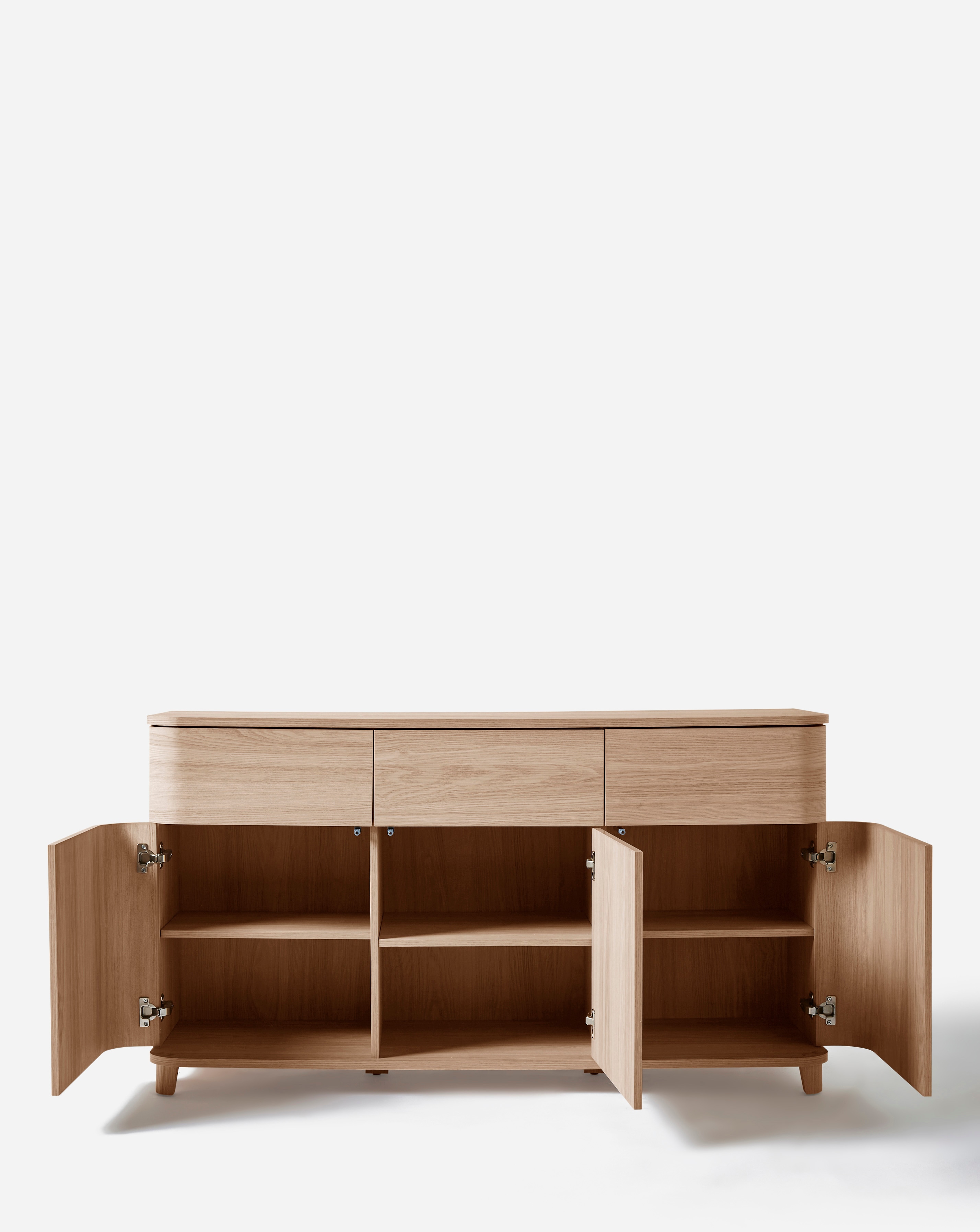 The Arden Large Sideboard has 2 drawers, and an internal shelf, push close on doors and drawers, finished eith curved sides in an oak effect. Self assembly required.