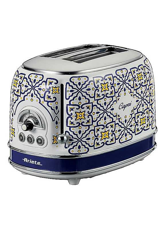 Bring a splash of colour and character to your kitchen with the Ariete ar5512 2-slice capri design toaster. Featuring a vibrant multi-coloured design inspired by the charm of Italy's Amalfi coast, this compact yet stylish appliance is crafted from durable stainless steel and backed by a 2-year warranty, making it a beautiful and reliable addition to your countertop. Perfect for everyday breakfast rituals, it offers defrost, reheat, and six adjustable toasting functions, so you can enjoy your bread just the way you like it. The auto eject feature ensures your toast pops up at the perfect moment, while the removable crumb drawer keeps your workspace tidy with minimal effort. Built with convenience and safety in mind, the toaster includes cool-touch sides, non-slip feet, and an integrated cable compartment with cord storage to keep your kitchen neat and organised. Compact yet full of personality, the ar5512 makes every morning a little more delightful.2 SlicePower: 810W6 Browning levelsRemovable crumb drawerCool-touch sidesNon-slip feetCord storage2 Year warrantyDimensions: H20x W30 x D19cm | bread toaster, colorful toaster, stainless steel toaster