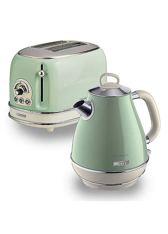Where timeless design meets everyday convenience, the Ariete vintage 2-slice toaster and 1.7l jug kettle set brings retro charm and modern performance to your kitchen. The kettle's nostalgic silhouette pays homage to classic styling, while housing all the modern features you'd expect such as a removable, washable scale filter, an ergonomic handle with soft-touch finish, and a cool-touch exterior for added peace of mind. Designed with your family's safety in mind, the 1.7l jug kettle includes an automatic shut-off feature to prevent overheating, giving you confidence and comfort with every use. Meanwhile, the 2-slice toaster is set to elevate your breakfast game, offering six browning levels for perfectly toasted bread and bagels. With practical additions like automatic pop-up, a removable crumb tray, and cool-touch sides, it's both easy to use and effortless to clean.Kettle: 1.7L capacity / 2000W / Removeable filter / Auto-off function / 360 degree swivel baseToaster: 2 Slice / 810W / 6 Browning levels / Removable crumb drawer / Non slip feet2 Year warrantyDimensions: Kettle: H20.5 x W22 x D22cm / Toaster: H20 x W30 x D19cm | green kettle and toaster, retro style toaster, retro style kettle, 1.7 litre kettle