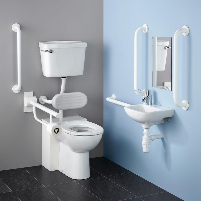 This Doc M pack is designed to make bathroom accessibility easier, without substituting beautiful design. It is specifically designed to the latest recommendations, with features that just make life a little easier for multiple generations. This pack includes a basin with a single taphole positioned on the side closest to the seated user for more convenient access. The taps include copper tails, which are preferred in many applications. A TMV3 approved basin mixer is included to help prevent scalding, and features an integral thermostat to reduce legionella risk. * Available as left or right hand option – to suit your specific layout * Comes in a choice of finishes – including blue and white * Doc M compliant – designed to the latest accessibility recommendations * TMV3 approved basin mixer – helps to prevent scalding * Integral thermostat – reduces legionella risk * Copper tap tails – preferred for many applications | Armitage Shanks Contour 21+ Doc M Pack Right Hand Rails in White