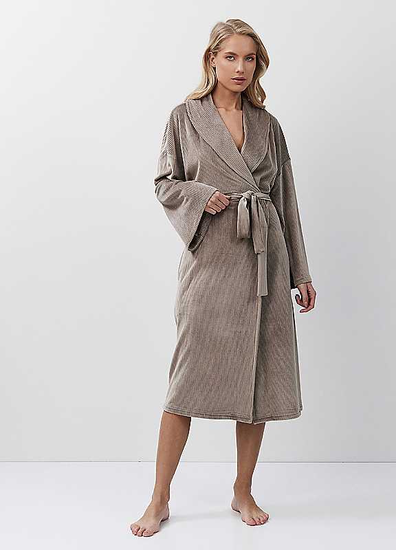 Long bathrobe with a thin and super soft ribbed texture. Made of soft polyester fabric. Features full-length sleeves with low cuffs. Hidden side pockets for a sleek look. Tied with a belt. Designed to fall below the knee.Washing temperature max at 30°CDo not bleachIron temperature max 110°CDo not dry cleanDo not use drum dryer95% Polyester, 5% ElastaneKeep away from fire. | wrap robe, soft bathrobe womens, midi robe