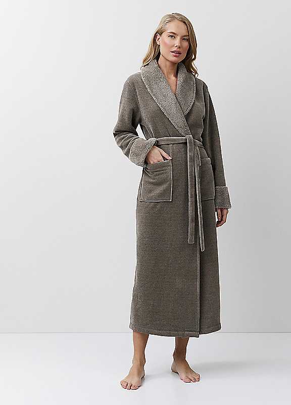 Long bathrobe with a knit-effect and plush texture. Made of a 2-sided soft polyester fabric with a knit-effect and plush texture. Features full-length sleeves with soft contrast plush cuffs. Designed with a plush shawl collar for added warmth. Square-shaped pockets for a structured look. Includes a matching fabric belt for an adjustable fit. Designed to fall to ankle length.Washing temperature max at 30°CDo not bleachIron temperature max 110°CDo not dry cleanDo not use drum dryer100% PolyesterKeep away from fire. | warm bathrobe womens, women's gray robe, soft plush bathrobe, bathrobe wrap, robe with pockets, plus size bathrobe, long bathrobe