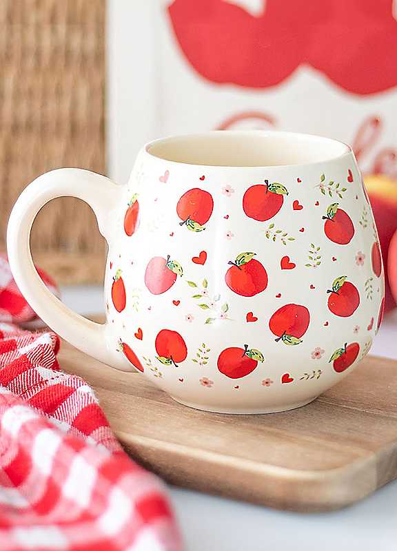 Enjoy your favourite hot drink in this charming ceramic mug, decorated with a playful apple print perfect for adding a splash of countryside style to your day. Great for cosy mornings at home or as a thoughtful gift for teachers and cottagecore enthusiasts. 550ml capacity. Hand wash only. Do not microwave.