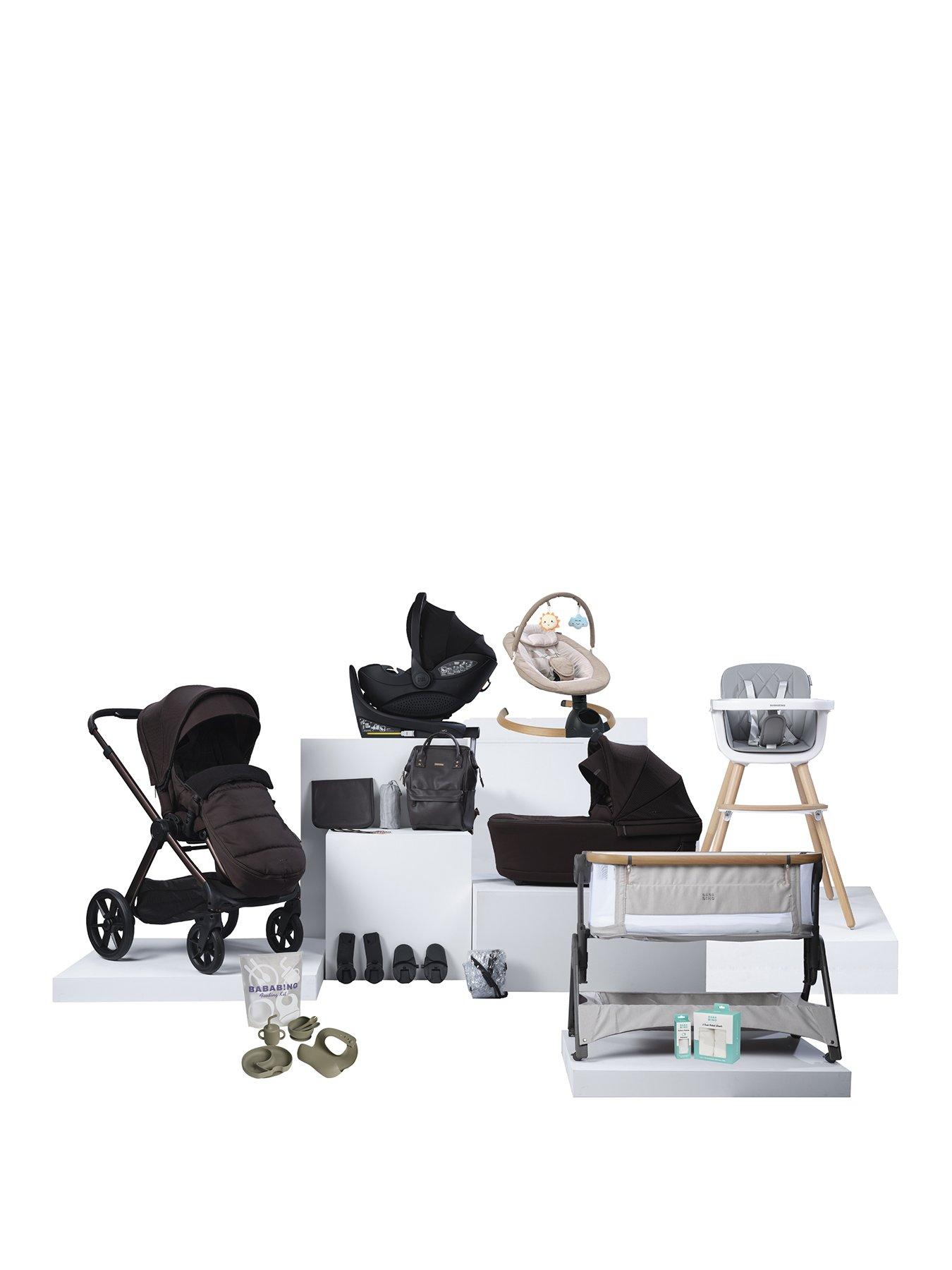 BabaBing! 18 Piece Raffi MKII Travel, Home & Feeding Bundle with Spin Car Seat & Isofix base - Coffee Stylish and practical, the Raffi 2.0 has a sleek anodised chassis finish and geo-quilted carrycot cover. Packed with improved award-winning features, you'll love the one-handed auto-folding. The carry cot easily collapses flat with the press of a button, saving space in the car boot or at home. The Raffi 2.0 can be folded with the seat unit on in both world and parent-facing positions. Improved and softer all-around four-wheel suspension gives an even smoother ride, with improved rim and all-terrain wheels to take any bumpy road in its stride. So, you can go anywhere and everywhere with total ease. The anti-reflux carry cot has an adjustable back rest so baby can be inclined slightly. Extra ventilation in the carry cot is great for overnight sleeping or for warm days. THE RAFFI CARRY COT IS SUITABLE FOR OVERNIGHT SLEEPING. The Raffi has an extra-large easy-access shopping basket, and the seat unit has an extendable hood feature for extra sun protection and shade all fabrics offer SPF 50 protection. All fabrics can be machine-washed at 30 degrees, and it has a 5-point magnetic safety harness. The handle height is 94cm. 18-piece Raffi 2.0 bundle includes: Raffi seat unit Raffi chassis/frame Raffi carry cot Footmuff Rain cover Car seat adapters Carrycot risers Changing bag Stroller clips Super-size changing mat Insulated bottle holder Hera Verto Spin car seat Hera Verto Spin ISOfix base Hub automatic swing Bedside and travel crib Bedside and travel crib carry bag Hera Verto Spin Car Seat: Suitable from birth R129-compliant (i-Size ready) ISOfix compatible Highchair