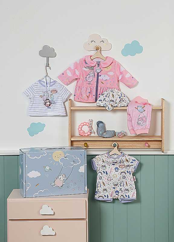A beautiful outfit for Baby Annabell with an adorable box to keep it all in - how cute! Our Baby Annabell First Arrival Set is the ideal gift or starter set for any little mummies or daddies. With a short sleeved romper, soft trousers, printed t-shirt, adorable cosy jacket, hat, shoes and more, the options are endless for dressing up Baby Annabell. Plus the box to keep it all in features a beautiful stork print with a little handle so it can double up and be carried around with other Baby Annabell belongings too!Baby Annabell First Arrival Set includes romper, t-shirt, trousers, jacket, hat, shoes, teething ring, charm, dummy and nappy. Styles may vary.Boosts the imagination and offers new possibilities and stimuli for nurturing play.Age suitability: 3+Adorable First Arrival Set for Baby AnnabelleThe perfect gift for any Baby Annabelle fan, plus dreamy box to keep it all inIncludes a short sleeved romper, soft trousers, printed t-shirt, adorable cosy jacket, hat, shoes & moreTo fit all 43cm Baby Annabelle dollsDoll not included