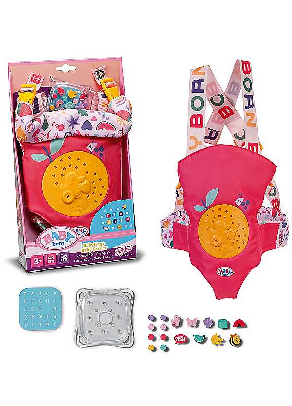 For children who want to keep BABY born close, this beautifully designed Baby Carrier does the trick! They can pop BABY born in the carrier and attach it to themselves - it can be worn on either their front or back - and adjust the straps to make it super-comfortable. This means BABY born accompanies your child wherever they go - to the park, the shops or even if they're simply pottering around the house. For added fun, the Baby Carrier comes with cool sewn-in patch and plastic decorative pins for adding an individual sense of creativity and flair. Once your child is done designing, you can keep any spare pins in the handy storage box.Colourful and comfortable baby carrier for keeping their doll close wherever they goGive the carrier an individual touch with figure-pins and letter-pins for personalisationFeatures adjustable straps that easily clip togetherIncludes bag, a changing mat and a nappyCan be worn on either the back or frontSuitable for 36cm and 43cm dollsSuitable for: 3+