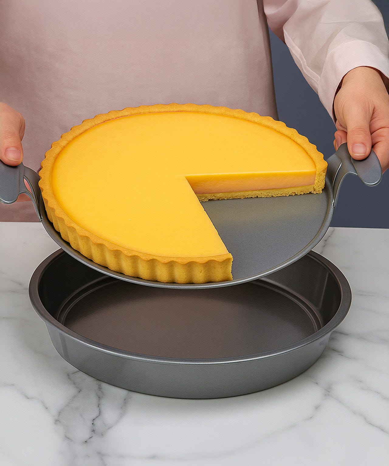 Such a clever design, the handles on the lift-out base of this round baking pan mean no more fiddly cutting around quiches, cheesecakes and tarts. Made from durable carbon steel. Hand wash only. Carbon steel. 28cm diameter, 4cm high.
