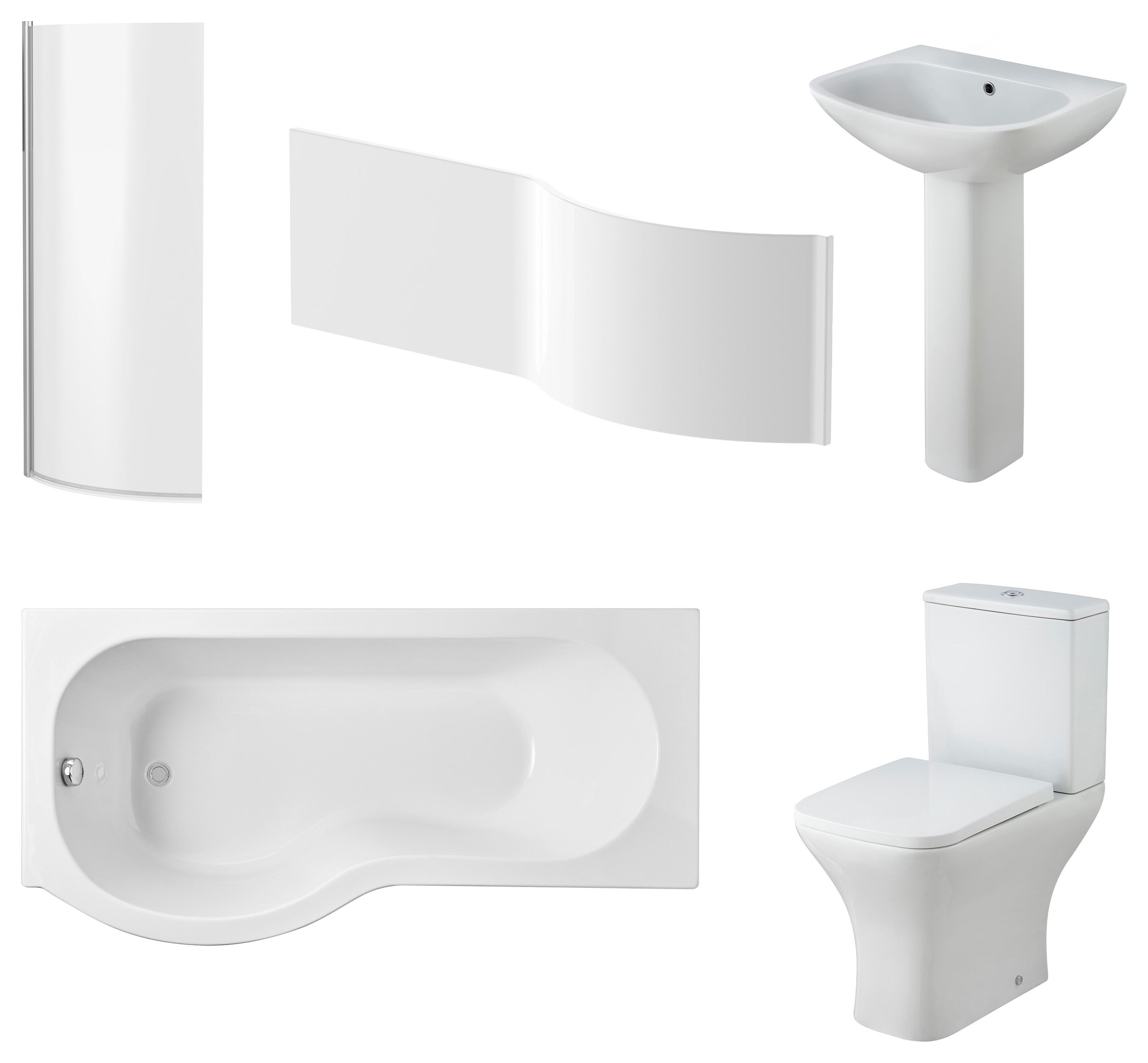Balterley 1700mm P Shaped Shower Bath Bundle - Left Hand - Faron Ceramics - This complete bathroom bundle provides the perfect foundation for creating your dream family bathroom. The set includes a 1695mm left-hand shower bath, a 6mm bath screen, and a matching side panel. A contemporary pedestal basin, soft square rimless pan, and cistern are also supplied, along with a soft-close toilet seat for added comfort and convenience.
