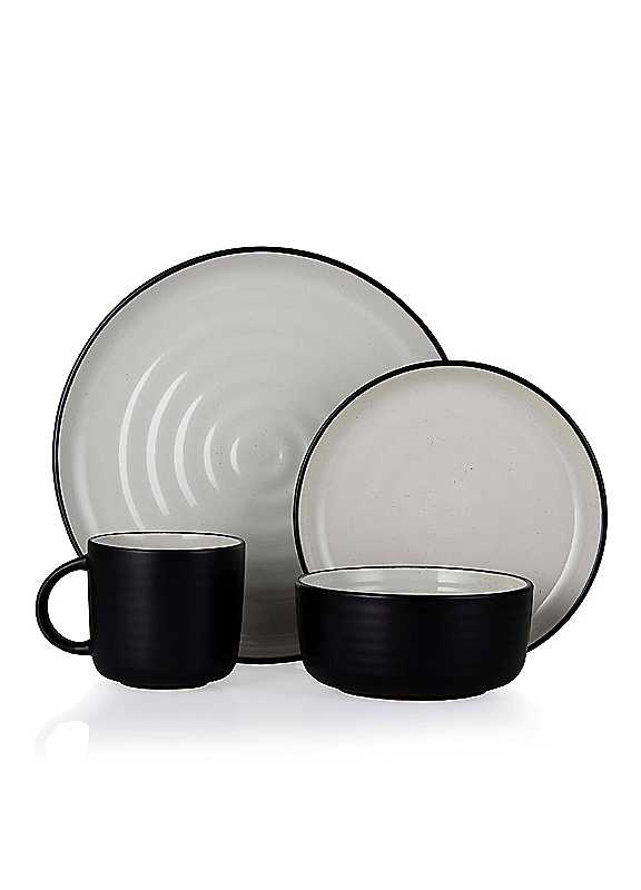 This Cascade Dinnerware Set intertwines modern design and classic colourways to give your dining room a rustic feel. Each piece is brought to life with a cream gloss interior which contrasts beautifully against the matte black outer coating. Finished with a distinct ripple-effect embossing on every item, this collection is sure to leave a lasting impression on your guests. This 16-piece set can serve up to 4 people at a time, providing you with 4 dinner plates, 4 side plates, 4 bowls and 4 mugs. The crockery is constructed using durable stoneware that's suitable for both special occasions and everyday use. Items are all microwave and dishwasher-friendly.HOMESPUN TREND: Designed with a matte black exterior, contrasting speckled cream gloss interior, with an embossed ripple-effect finish, each Cascade piece is wonderfully tactile, adding a touch of artisan style to your homePERFECT FOR EVERY DAY: Serve delicious meals & drinks to family & friends with 4 dinner plates (26.7cm/10.5 inch), 4 side plates (20cm/8 inch), 4 bowls (15.2cm/6 inch) & 4 mugs (0.39L)QUALITY STONEWARE BODY: Created with a ceramic stoneware body for long-lasting quality, each Cascade piece will see you through countless breakfasts & dinners. The perfect choice for modern, fashionable tablewareMICROWAVE & DISHWASHER-FRIENDLY: Each piece is perfectly safe to pop into the microwave or dishwasher - perfect for easy entertainingFASHION FOR THE HOME: This Cascade set is from the Barbary & Oak by Tower collection, bringing international fashion, entertaining & design trends into your home3 YEAR GUARANTEE: Trusted Tower quality with a standard 1 year manufacturer's guarantee & a 2 year extension, subject to product registration onlineStonewareDimensions approx. 3.00 x 26.50 x 26.50 cm